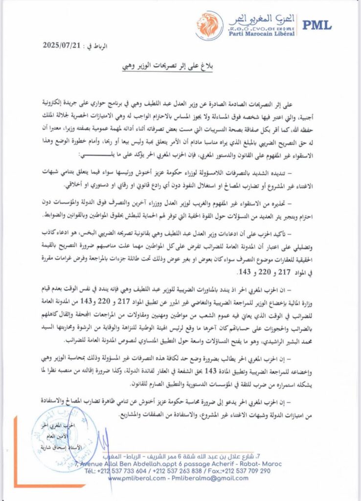 عبر الحزب المغربي الحر عن استنكاره الشديد لتصريحات وزير العدل عبد اللطيف وهبي، والتي أدلى بها خلال حوار إلكتروني اعتبر فيه أن “الأشخاص فوق المحاسبة”، في ما اعتُبر إهانة واضحة للسلطة القضائية ومساسًا بثوابت المملكة.