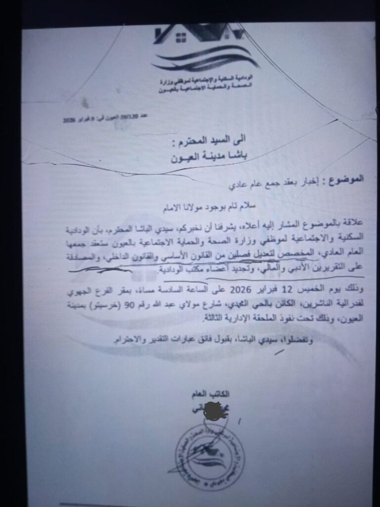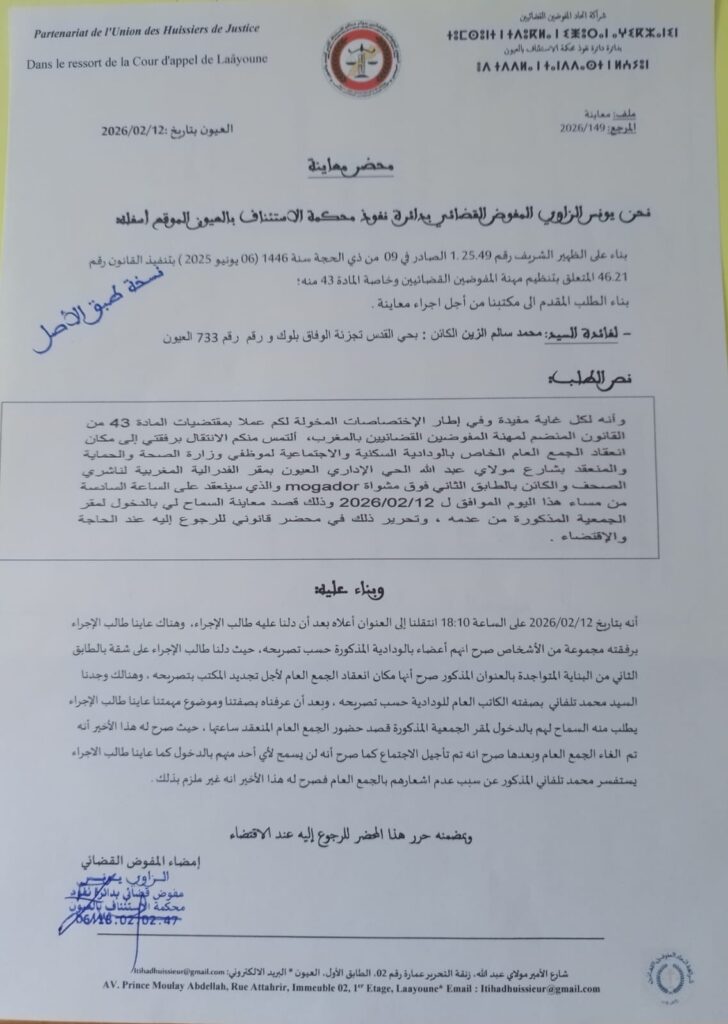 العيون – تكشف الوثائق الرسمية المتعلقة بالودادية السكنية والاجتماعية لموظفي وزارة الصحة والحماية الاجتماعية بالعيون تناقضًا واضحًا بين ما ورد في البيان الصادر عما يسمى بالمكتب المسير، وبين المعطيات الثابتة في الإشعار الموجه إلى السلطات المحلية ومحضر المعاينة القضائي.